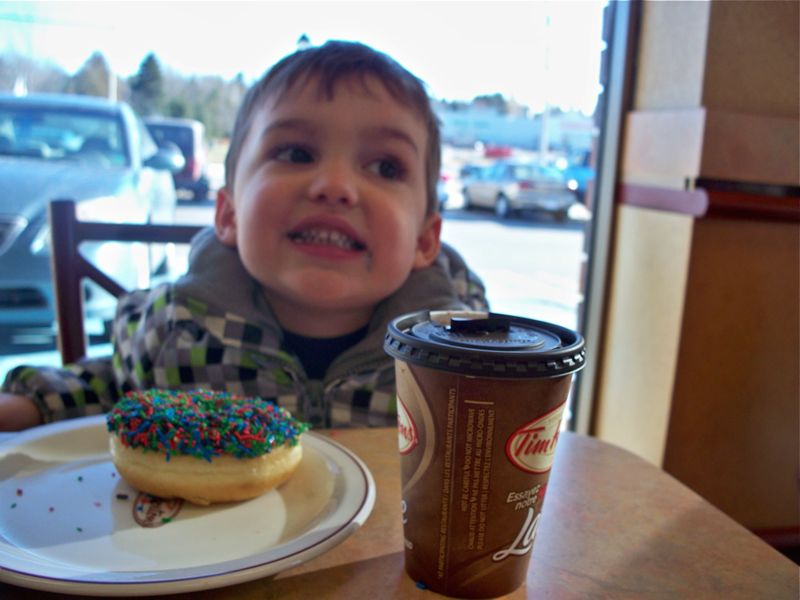 Eben and mommy got to go on a special date this week. Eben will go to kindergarten in the fall so he went this week for his assessment. He did such a great job that mommy took him out for a doughnut and hot cocco.